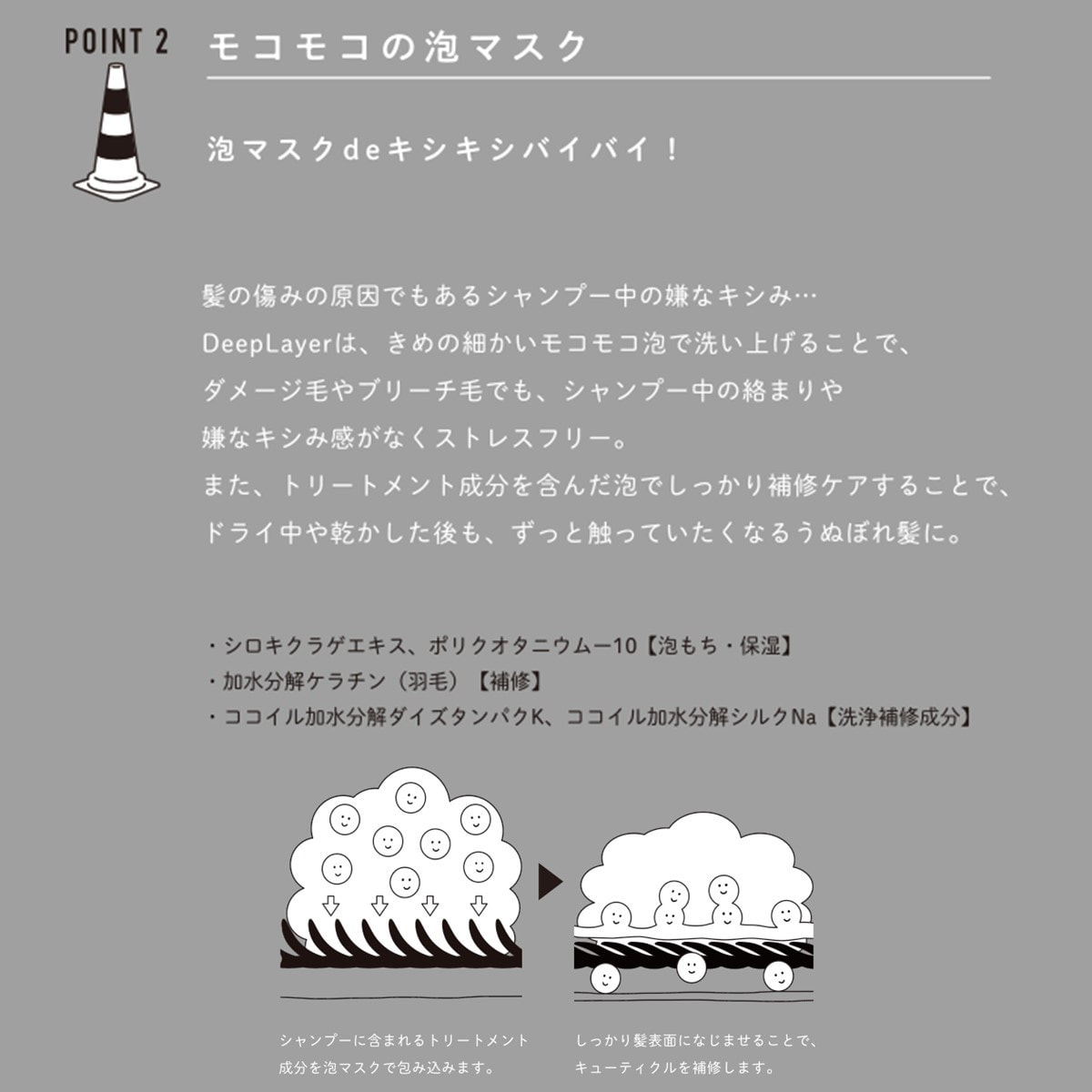 ■金属イオン吸着:シャンプーでゴワつきの原因である水道水中の金属イオンを吸着し洗い流すことで毛髪表面の環境を整えます。