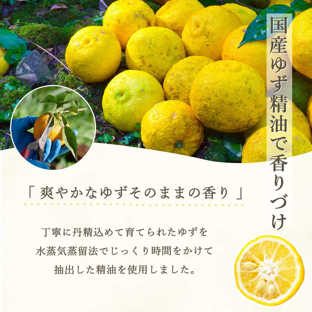 高知県産ユズ精油の爽やかな香り。