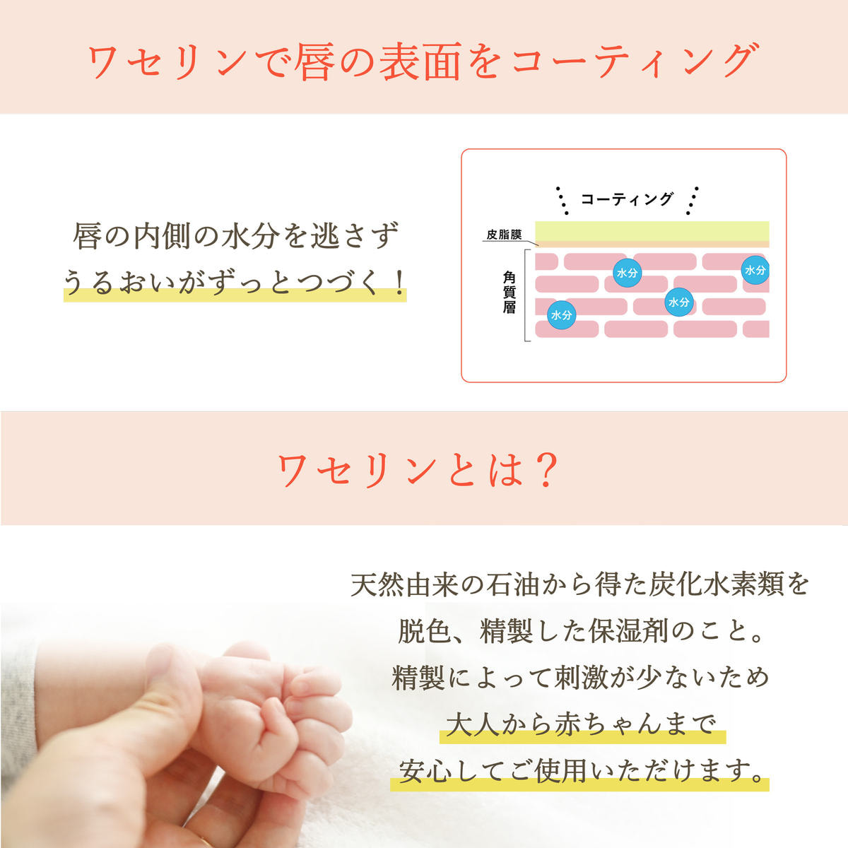 ●唇や肌に合わない時、使用中に赤み、はれ、かゆみ、刺激、色抜け(白斑等)や黒ずみ等の異常が出た時、日光があたって同様の異常が出た時は使用を中止し、皮フ科医に相談してください。使い続けると症状が悪化することがあります。