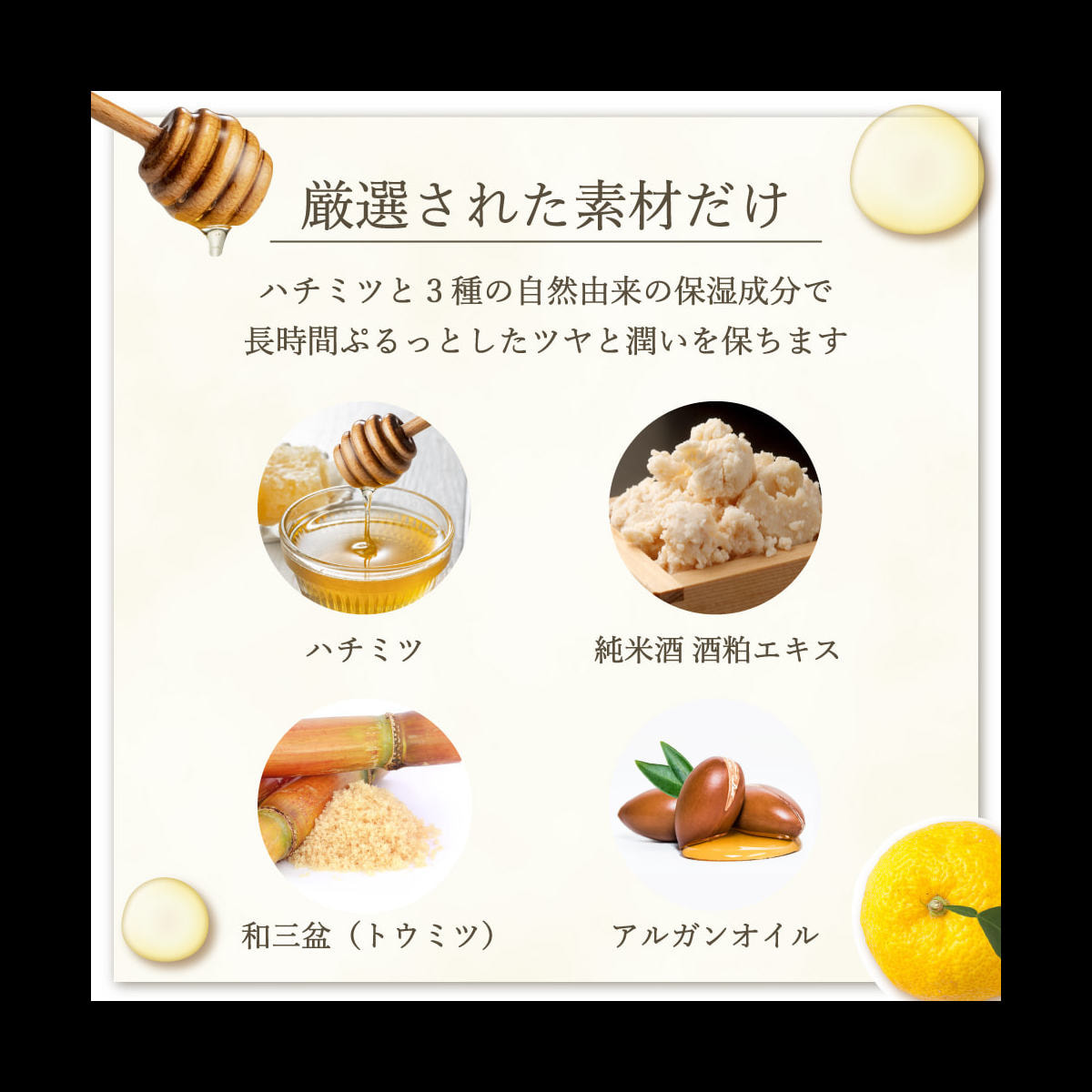 ユズ種子油、アルガニアスピノサ核油、ハチミツ、トウミツ、酒粕エキス